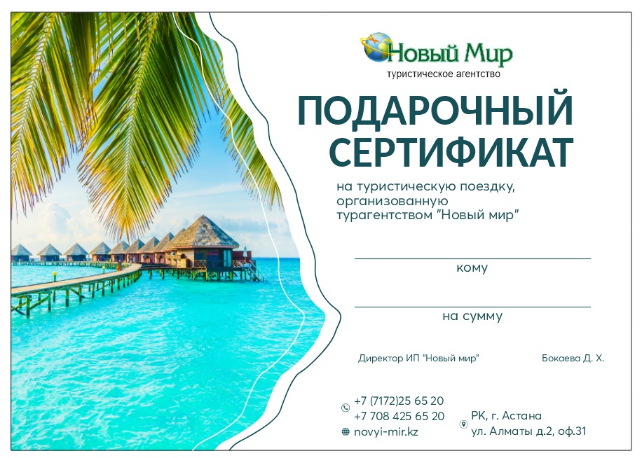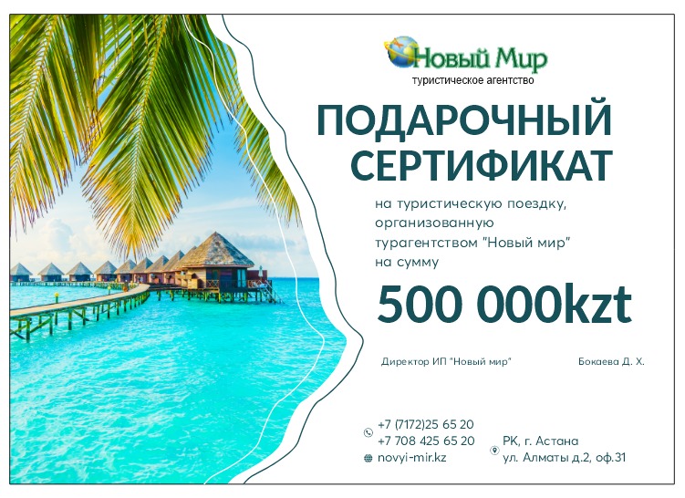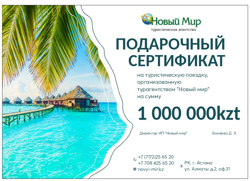 В нашем турагентстве можно приобрести сертификаты номиналом 500000тг, 1000000тг и на выбранную вами сумму тура .